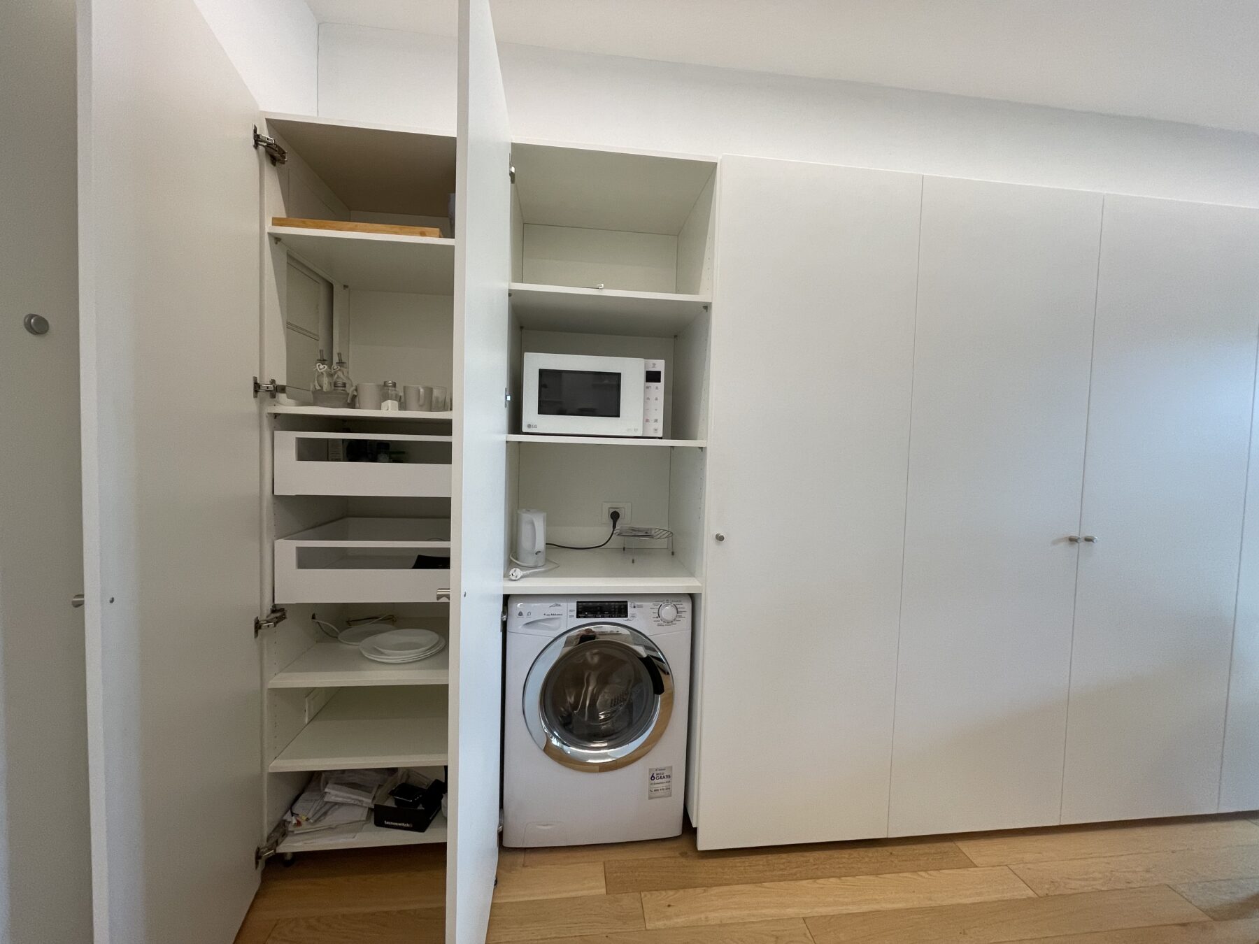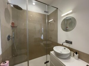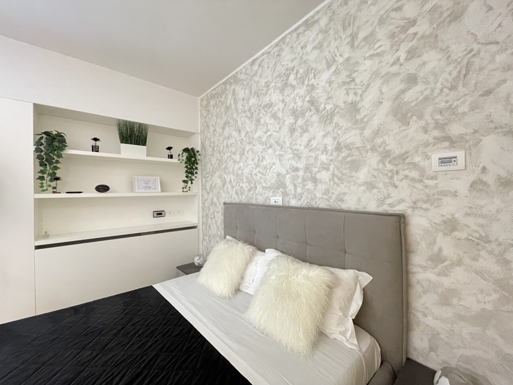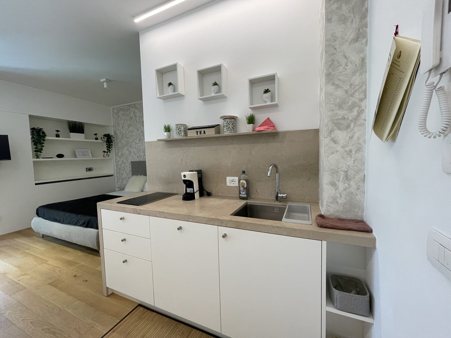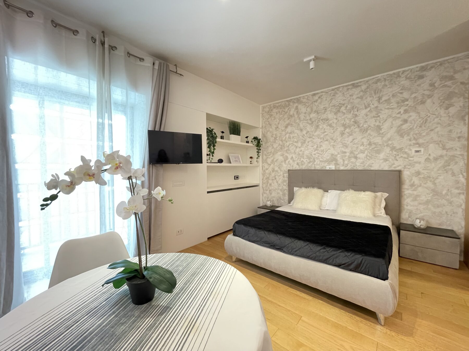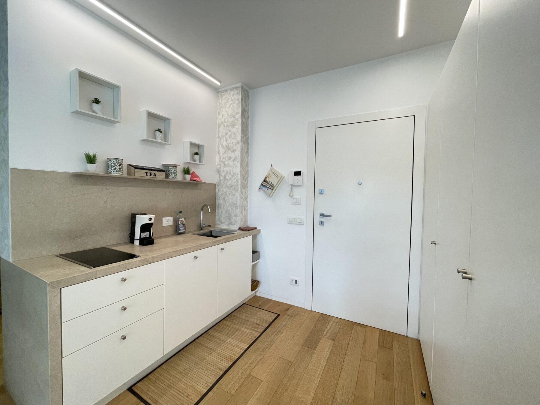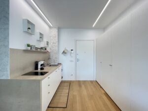 L’appartamento si cede completo di arredi realizzati su misura da un esperto ebanista, come le spaziose armadiature. La zona cucina, composta da materiali pregiati, è dotata di piano induzione, frigorifero/congelatore, lavastoviglie, lavasciuga e microonde integrati nel mobilio. Il bagno è molto ampio ed è stato realizzato con pregiati inserti; completo di box doccia in cristallo e mobiletto contenitivo; separato da un cristallo opacizzato e una porta scorrevole in legno betulla, entrambi a tutta parete. Comodo balcone con affaccio su Corso Italia dotato di mobile contenitivo.