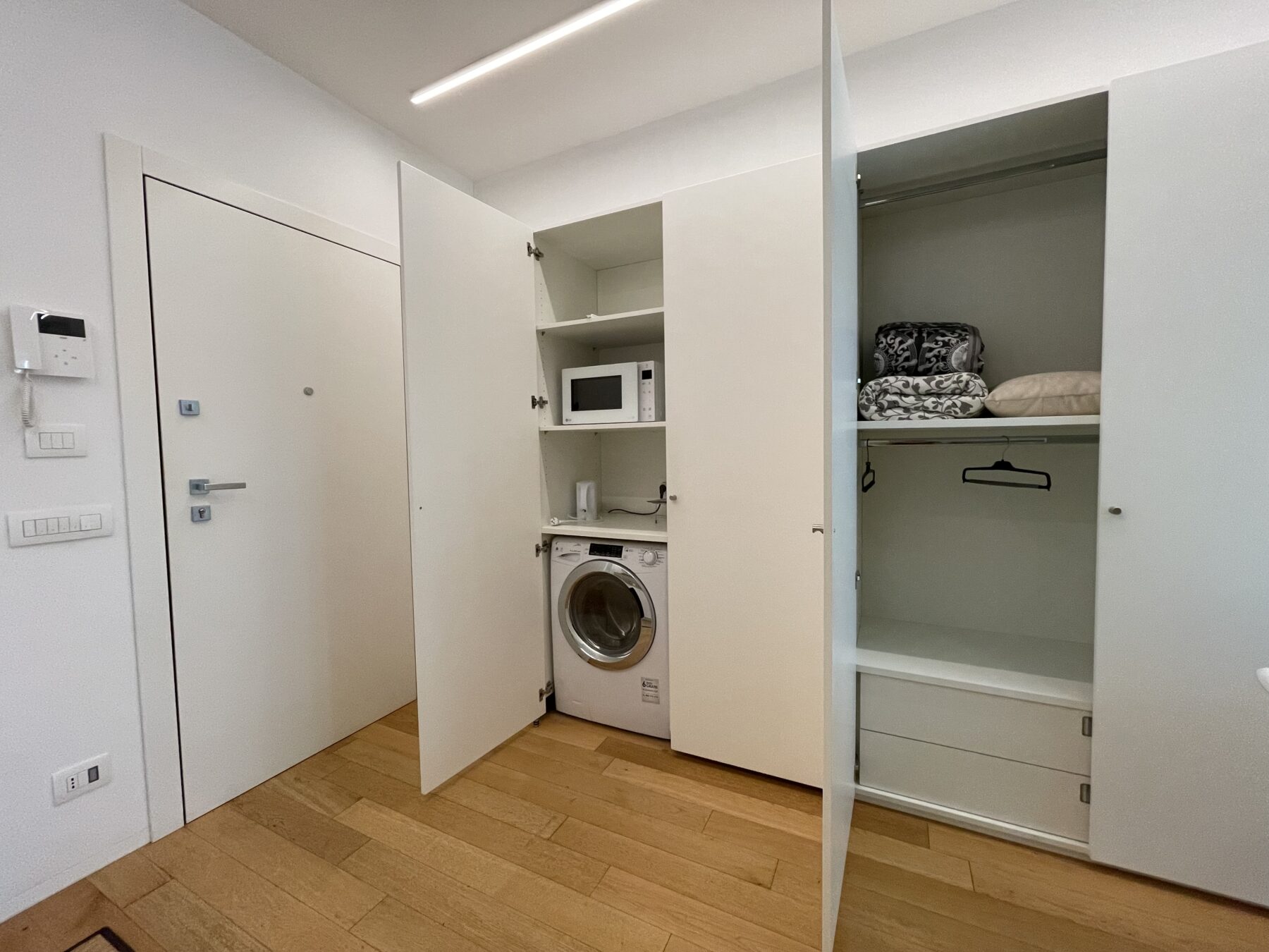 Porta blindata, Illuminazione con faretti e led, antenna satellitare, cavi internet, video citofono, gestione autonoma della funzione di raffrescamento e riscaldamento, grazie ad un termostato a parete e ad un comodo comando di un fan coil nascosto dietro apposita pannellatura. Un immobile pronto e unico nel suo genere.